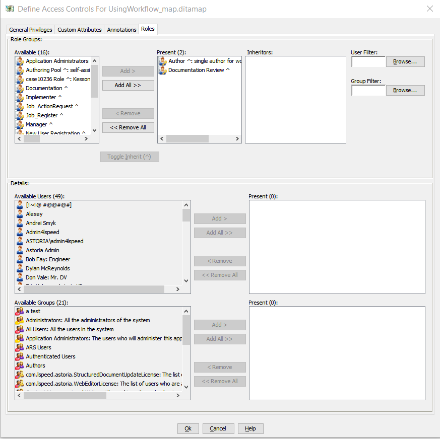 Use the Role tab to assign users or groups to a role on the selected object. Members of a role are granted the privileges defined by the role, and can be selected to participate in workflow tasks.
